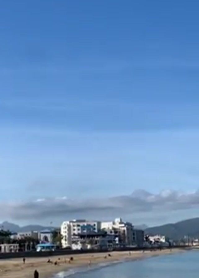coastal scene under a bright blue sky with scattered clouds. Initially, a sandy beach is visible with several people walking or sitting along the shore. In the background, there are buildings and mountains partially obscured by a light haze. The camera then pans towards the ocean, and the view shifts to a building on stilts extending into the water. Large rocks line the foreground, and the water is calm with small waves. The building on stilts has a distinctive architectural style, suggesting a resort or restaurant structure.