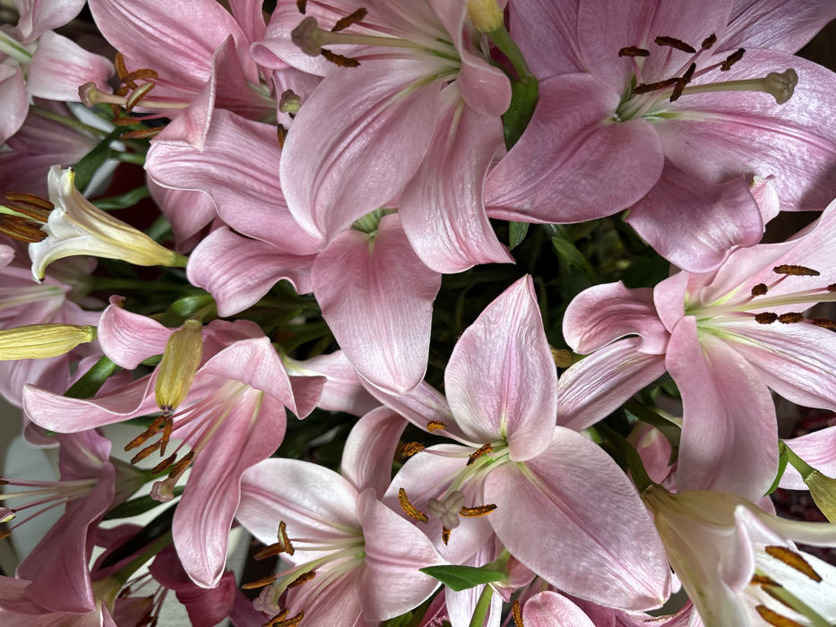- "This image captures a dense, close-up perspective of a bouquet consisting primarily of multiple light pink lily flowers (Lilium genus), located in Naucalpan de Juárez, Mexico" by FM-LuzOX2, licensed under CC BY 4.0