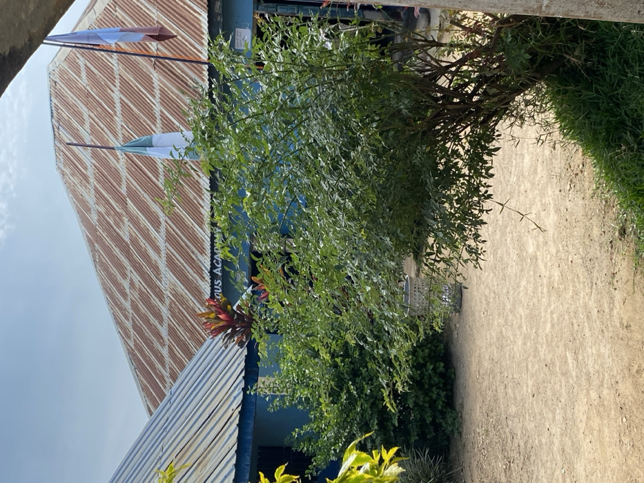 This image presents an outdoor view of the "OUS ACADEMY" in Du, Nigeria, under natural daylight with a clear sky. The main building, situated in the background, is painted light blue and features a severely rusted, corrugated metal roof. Partial white lettering "OUS ACADEMY" is visible on the building's facade below the roofline. Two flagpoles extend above this structure; the left pole displays a green and white striped flag, consistent with the flag of Nigeria, while the right pole holds a flag with vertical white/light blue and reddish-brown stripes. To the left, a second blue building with a less rusted, silver-gray corrugated metal roof is partially observed. The foreground and midground are filled with dense green foliage from several bushes. A light-colored plastic basket is positioned on the dry, light brown dirt ground between two of these bushes. A plant with prominent red and yellow variegated leaves is visible between the two buildings. No individuals are present within the frame.