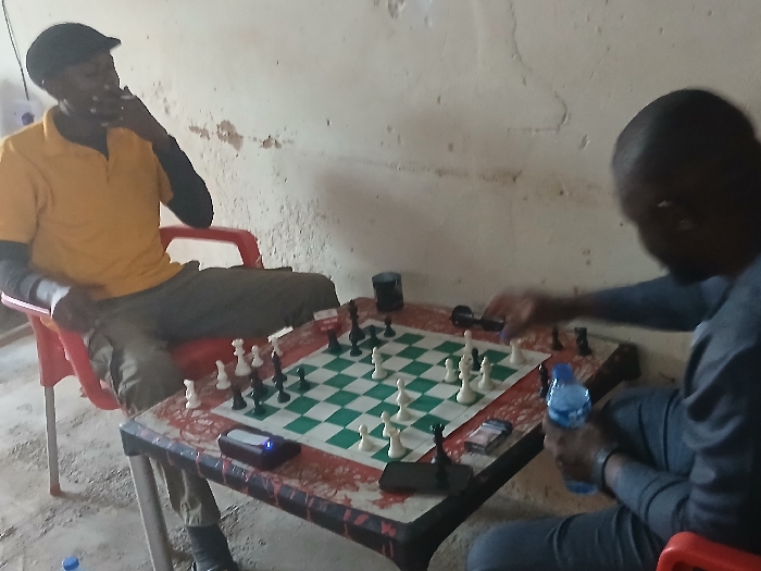 Two men are engrossed in a chess match. One player, in a yellow shirt and cap, sits back in a red chair, contemplating his next move. His opponent, dressed in gray, leans forward, hand poised over the board. The chessboard sits on a table with a patterned surface. A chess clock, bottle of water, and pack of cigarettes are visible on the table. The setting appears to be indoors, with plain, slightly weathered walls in the background.