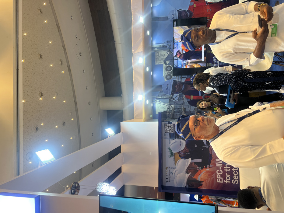 The scene depicts an active indoor exhibition or conference hall in Itirin, Nigeria. Overhead, the high ceiling features a mix of recessed spotlights and bright square panel lights, illuminating white structural beams and ceiling panels. In the immediate foreground, an older Caucasian male with a white beard and glasses is positioned on the left, wearing a white agbada-style tunic, a blue and gold patterned cap (fila), and a lanyard. He is looking right. To his right, an African male, similarly dressed in a white agbada-style tunic, blue and gold fila, and a lanyard, holds a dark smartphone in his left hand while looking slightly left. Between these two men, a woman in a dark patterned dress, possibly holding documents, is partially visible. Further back, another woman in a dark top is seen with her right hand raised, fingers forming a 'V' gesture, near an exhibition stand. The background is dominated by a prominent blue-themed exhibition stand for 'FELTON Energy Services Ltd.', displaying large printed graphics of personnel in hard hats and safety vests. Text on the stand includes 'EPC-IM for the Sector' and a visible QR code. A digital display screen embedded in the stand shows a worker. Additional blue wall panels with industrial imagery and 'FELTON' branding extend into the background. White chairs are arranged in front of the stands. A person's head and shoulder are visible in the lower-left foreground, wearing a white top.