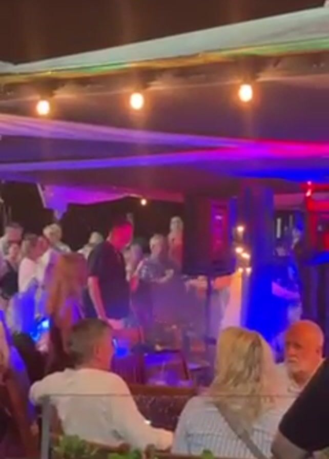 crowd of people, mostly white and seemingly older, gathered at an outdoor bar or restaurant at night. The space is lit with string lights, as well as red and blue lights pointed at the stage area. Some people are sitting at tables, while others are standing near the performance area, many raising their hands or dancing. Musicians wearing bright yellow shirts can be seen on stage. The camera moves slightly, providing different views of the crowd and stage. There’s a sense of a lively, energetic atmosphere.