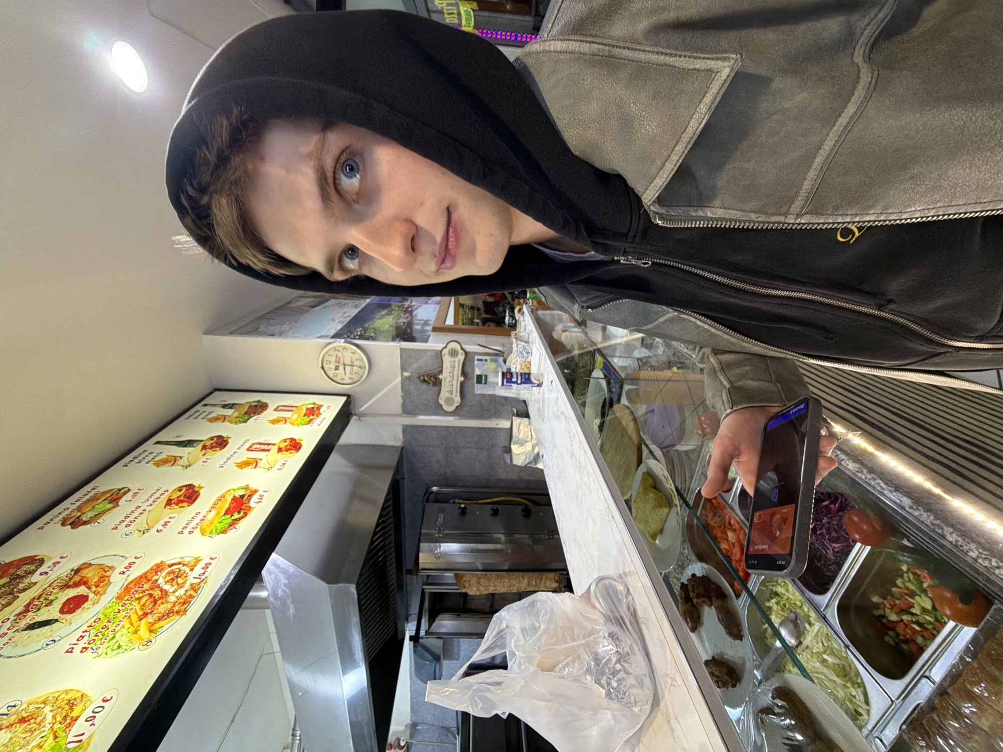 The image displays a young male individual inside a casual takeaway food establishment in Milan, Italy