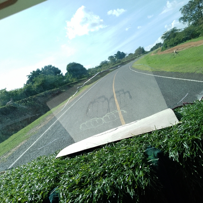 The image displays a daytime view of a paved road in Kola ward, Kenya, captured from the interior of a vehicle through its windshield
