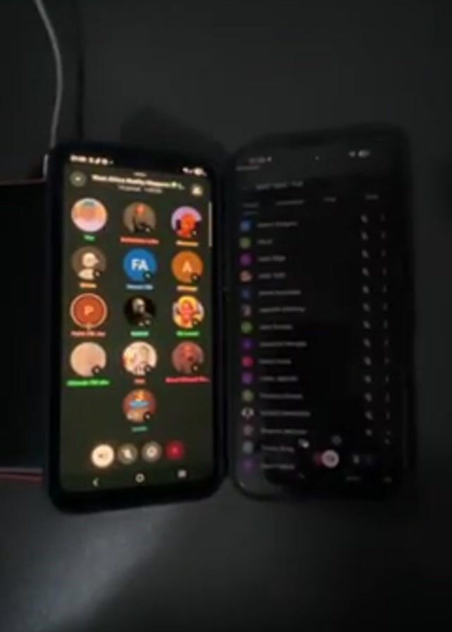 two smartphones lying side-by-side on a dark, possibly black, surface. On the left is an Android phone, displaying a group chat interface with multiple circular profile icons and names of group members. The phone on the right, likely an iPhone, also displays a list of contacts or chat participants, also with circular profile icons next to their names. The screens of both phones are lit up, suggesting they are active. A small portion of what appears to be a black cable and a red and black object are visible in the background. The overall lighting is dim, making the screens the primary source of illumination. There is an audio track playing in the background of what sounds like a voice recording.