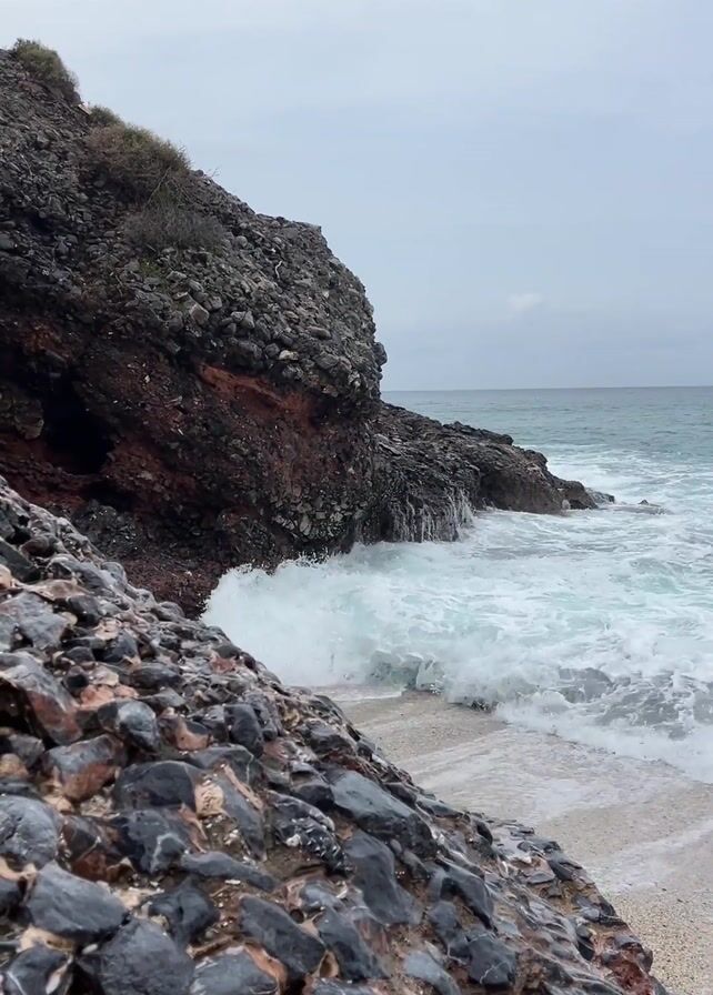waves crashing against rocks on a beach. The sky is overcast and grey, suggesting it is a cloudy day. The sea is a turquoise-blue color with white foam on the waves. The rocks are dark grey, black, and red. Some vegetation can be seen growing on the cliff. The camera pans slightly to the right to show the ocean.
