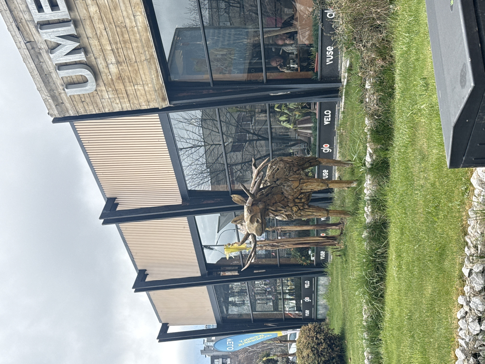 commercial building with a stylized wooden moose sculpture on the lawn in front
