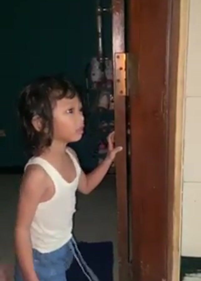 A young child with short, dark curly hair stands next to a partially open wooden door, holding onto the doorframe with her left hand. She wears a white tank top and blue denim shorts with the ties dangling. The child looks to the side and speaks, and then looks directly at the camera. Behind the child, the wall is painted in a dark teal color. A metal rack holding various items is visible. The floor appears to be tiled with a small blue rug near the child’s feet. The adjacent wall is white.