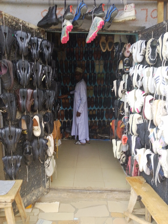 The image depicts the entrance of a shoe store in Bukuru, Nigeria, viewed from slightly outside