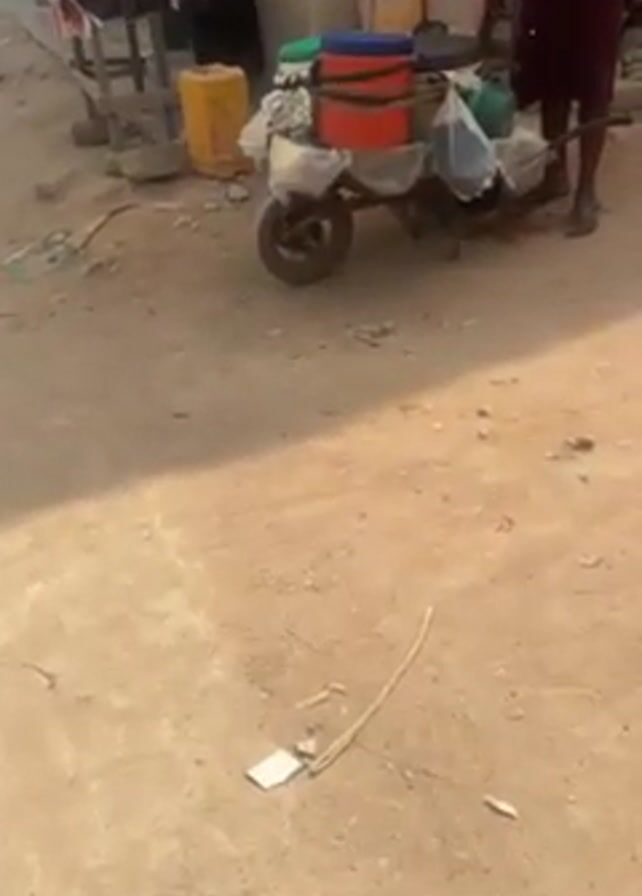 person standing next to a wheelbarrow filled with various items. The wheelbarrow contains several colorful plastic buckets, a green bowl, and some items wrapped in plastic bags. The person is wearing a maroon dress, sandals, and a black crossbody bag. They are interacting with another person who is holding a small black bag. The ground is a dusty, sandy surface with some scattered debris. In the background, there are other plastic containers and buckets, suggesting a market or storage area.