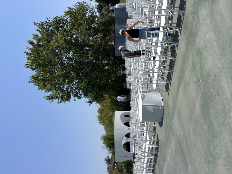 The image depicts an outdoor event setup in Ga'ash, Israel, under a clear, cloudless blue sky. The ground consists of a flat, light-green paved surface with visible cracks and wear. Rows of white Chiavari-style chairs with white seat cushions are extensively arranged across the foreground and midground. A single round table, draped in a white cover, is centrally positioned among these chairs. In the mid-left background stands a white structure with three prominent arches. To its right, a large deciduous tree with dense green foliage dominates the background. Further to the left, weeping willow and palm trees are visible. Grey, modular structures are present in the far right background. Three individuals are observed. One male, wearing a white short-sleeved shirt and light shorts, stands upright in the left mid-ground. In the right foreground, a male, dressed in a dark t-shirt, light baseball cap, and light pants, is bending over and interacting with the chairs. Adjacent to him, a female, clad in a dark tank top, blue jeans, and a light head covering, is also bending over, engaged in arranging the chairs. The scene illustrates the active preparation and setup of an outdoor event.