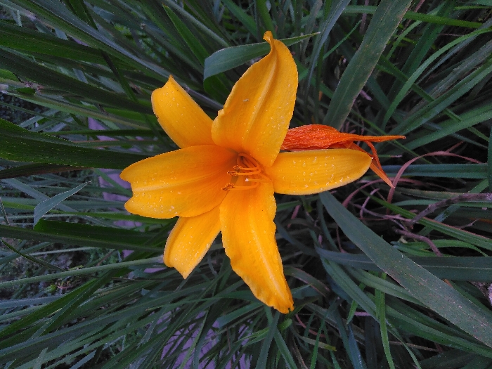 A single orange-yellow daylily (Hemerocallis) is centered in the frame, viewed from above, surrounded by dense green foliage. The flower exhibits six petals, with visible stamens and a central pistil, all in shades of orange. Small water droplets are present on the petals, suggesting recent precipitation or dew. One petal at the bottom appears partially folded or damaged, exposing a deeper orange underside. The background consists of long, slender, blade-like green leaves, blurred to provide depth of field. The scene is located in Unknown, Norway. No individuals or man-made objects are discernible.