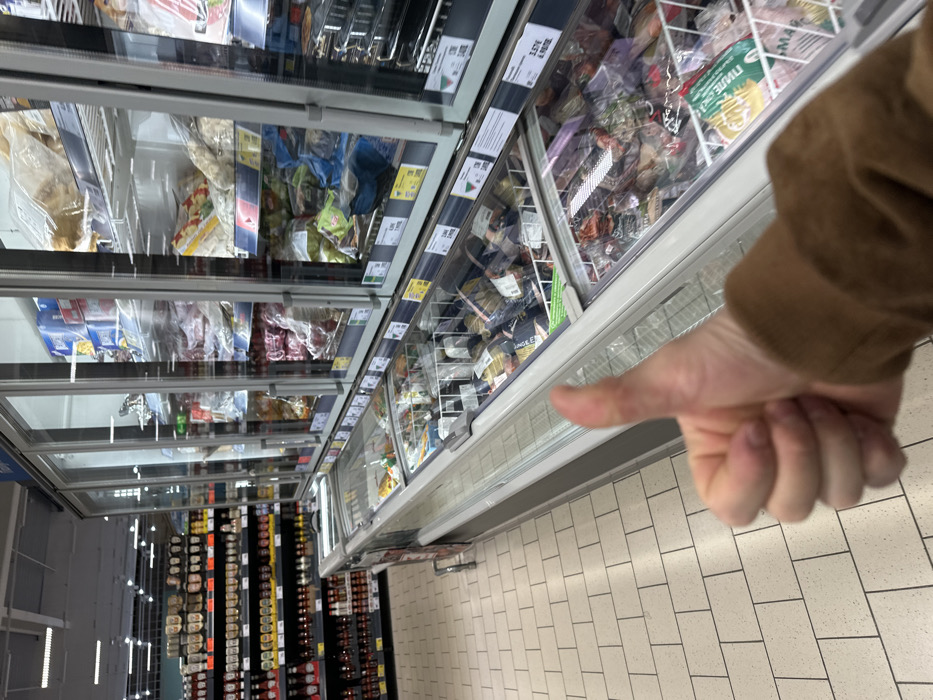 An interior photograph captures a supermarket aisle in Sofia, Bulgaria, identified by price tags displaying "BGN" (Bulgarian Lev). In the lower right foreground, a person's right hand, clad in a brown sleeve, executes a "thumbs up" gesture. The floor consists of light-colored rectangular tiles with dark grout. The midground features a long row of commercial freezers: an upper tier of tall, glass-doored vertical freezers containing packaged frozen goods, and a lower tier of chest-style freezers with sliding glass tops also filled with various frozen products. Price labels are visible on the freezer units. In the background on the left, multi-tiered shelving units are stocked with numerous jars and bottles. Overhead artificial lighting illuminates the scene.