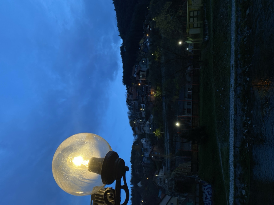 The image captures an urban twilight or nighttime scene in Uzice, Serbia. The foreground, upper left, prominently features an illuminated spherical streetlamp, visibly dirty, emitting warm yellow light. Below the lamp, a dark body of water, likely a river, flows with faint reflections on its surface. The immediate riverbank on the left exhibits a stone or concrete structure with graffiti markings on a lower wall, leading to a grassy area. The midground consists of a level grassy plot containing several modern-style streetlights, which are actively illuminated, casting pools of light. A small, dark coniferous tree stands within this area. Behind the grassy plot, low-rise buildings, some partially obscured, are visible, bordered by a fence. On the midground's right, a yellow utility box or small structure is present. The background features a steep hillside densely covered with numerous residential houses. Many of these houses display illuminated windows or individual exterior lights, indicating occupancy. Above the residential area, the hillside ascends into a dark, tree-covered natural landscape, silhouetted against a dark blue, heavily clouded sky. No individuals or specific actions are discernible.
