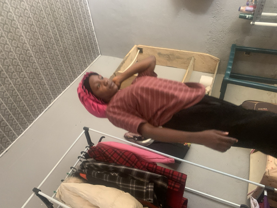 A woman wearing a pink head covering and a striped shirt is positioned diagonally across the frame. She appears to be in a cluttered indoor space. A clothes drying rack with various garments occupies the lower left corner, while a wooden structure and a metal shelving unit are visible in the background. Sunglasses are visible near the center of the image and luggage or a bag to the right. The wallpapered wall on the left and light-colored walls contribute to the room's overall neutral tone.
