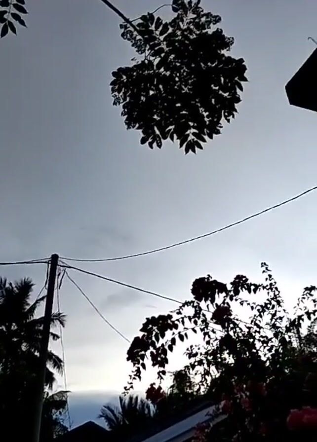 The camera looks upward to the sky, revealing an overcast, bright sky peeking through the clouds. Silhouetted trees are positioned in the foreground, with a dense, round-shaped tree directly above. Power lines run across the frame. A corner of a building, appearing to be the roof overhang, intrudes on the right side of the shot. The camera pans slightly upwards. A bush with pink flowers is visible in the lower right, partially obscuring a building with a light on. A palm tree and a utility pole are also seen, further back. The scene suggests an early morning or late evening atmosphere.