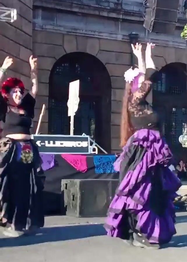 Two women in Halloween costumes dance outside in front of a building. The dancers both wear lace tops, patterned waist scarves, and black skirts with colorful ruffles. The woman on the left wears a red floral headpiece and has white face paint that mimics a skull; the woman on the right wears a white floral headpiece and lilac-colored eye makeup. Both women have their arms raised, alternating between pointing and twisting their hands. In the background, a banner with the word "K-LLDEROS" rests on top of speakers. A large stone building, stage lights, and other people are also visible in the background.