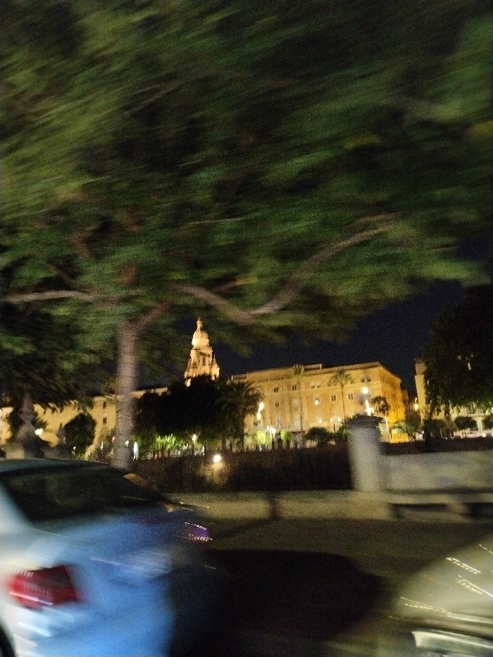 A nighttime shot captures a building with a prominent dome illuminated against the dark sky. A large tree dominates the foreground, its branches obscuring the view. Cars are visible in the lower portion, suggesting movement. The scene is urban, with streetlights and other buildings faintly visible in the background, contributing to the city's ambiance.