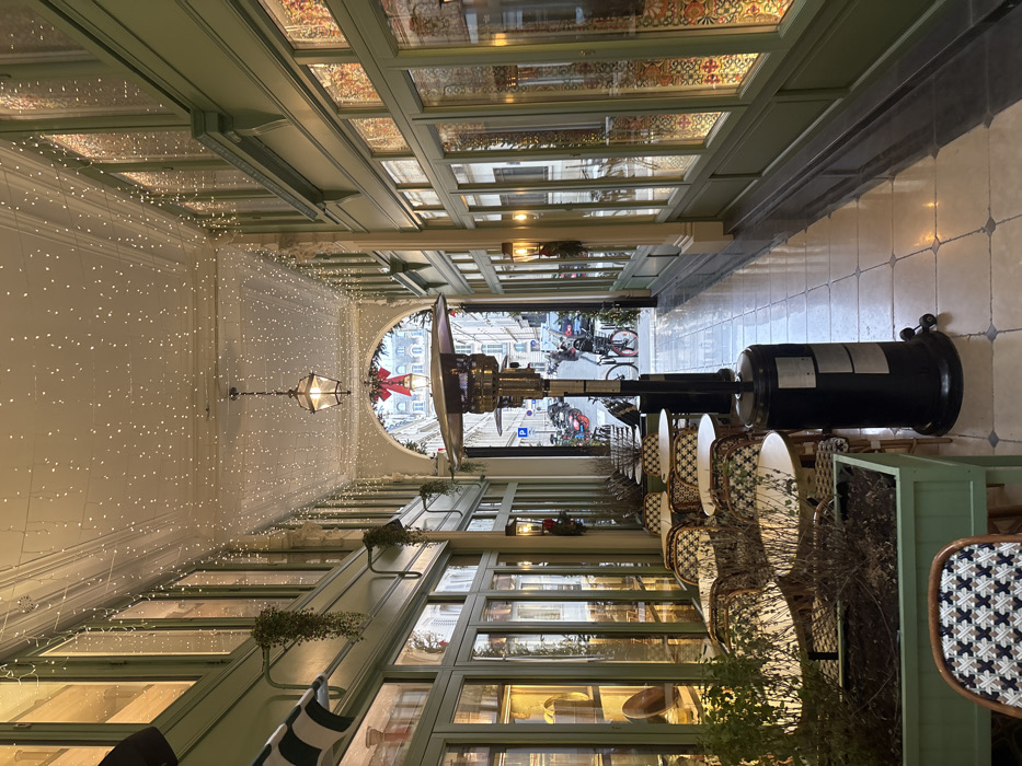 The scene depicts a covered pedestrian passageway, identified as a "passage couvert" in Paris, France, likely the Passage des Panoramas in the 2nd arrondissement. The long, narrow passage is viewed facing an arched exit leading to a street. The ceiling of the passage is adorned with numerous small white string lights, creating a sparkling effect, from which a single ornate, antique-style lantern hangs centrally. The walls on both sides are lined with establishments, featuring sage green painted wooden frames for large windows. On the left side of the passage, a cafe terrace is arranged with several small, round, light-colored tables and patterned wicker chairs with dark and light squares. Along the wall, rectangular planters contain sparse, dry vegetation. A large, black, industrial-style patio heater stands prominently in the middle of the passage, near the cafe seating, with a metallic hood. On the right side, the windows of the establishments display various patterns, possibly tapestries or decorative elements, illuminated from within. Wall sconces with warm light are also visible along this side. The floor throughout the passage is tiled with a pattern of light and dark squares, reflecting some of the overhead lighting. At the far end, an elegant arched doorway, decorated with a festive red bow and green foliage, frames the view of an external Parisian street. Through the archway, classic Haussmannian buildings with grey facades and mansard roofs are visible. The street itself appears narrow, with several parked cars, scooters, and a bicycle. A blue "P" parking sign is also discernible. The lighting suggests dusk or evening, with reliance on artificial illumination within the passage and shops. No individuals are clearly discernible within the immediate foreground or mid-ground of the passage.