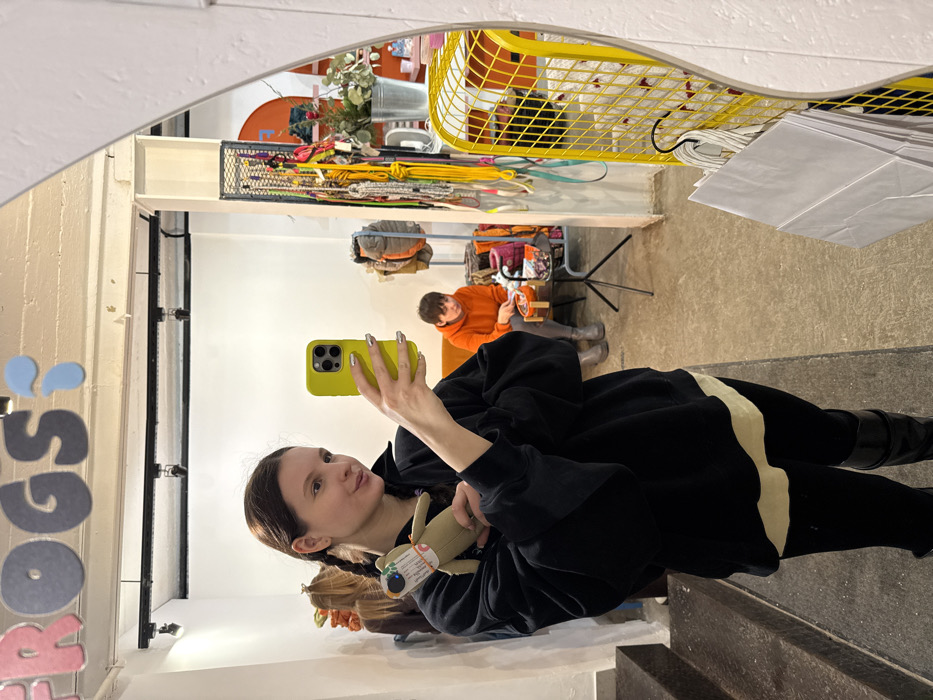 An interior mirror selfie captures a scene within the "FROGS Shop," a pet accessories store located in Moscow, Russia. The primary subject is a young adult female, depicted from the upper thighs up. She has dark hair styled in two braids and is wearing a black oversized sweatshirt over a light-colored undershirt, black leggings, and black tall boots. Her left hand holds a lime-green cased smartphone, directed towards the mirror to capture the image; her fingernails are painted with a metallic finish. Her right hand cradles a light-brown, frog-shaped stuffed toy bearing a tag. She exhibits a slight smile. Reflected in the mirror, the store's interior features white walls, a light grey concrete floor, and industrial overhead lighting. Large, multi-colored letters spelling "FROGS" are affixed to the upper portion of the wall. To the right of the main subject, a second individual with short dark hair, wearing an orange hooded sweatshirt and grey pants, is seated on an orange bench. This person is occupied with small items on a low, dark, tripod-mounted table. Along the right wall, numerous colorful pet leashes, collars, and harnesses are displayed on hooks attached to a vertical metal grid. A silver bucket holding green foliage is positioned behind this display. Further to the right, a yellow metal-grid structure, possibly a large display cage, contains white soft items. White paper shopping bags with handles hang from a hook near the mirror's edge. A dark staircase is partially visible on the far left of the reflection.