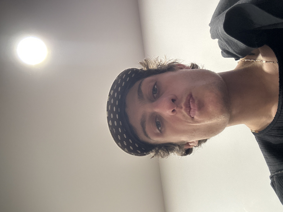 An upward-angle selfie depicts a young adult male with a light complexion, curly dark hair, and blue eyes. He wears a dark-colored cap with light polka dots and a dark, ribbed long-sleeved shirt. A thin gold-colored chain necklace is visible. His lips are pursed, and he looks directly at the camera. A dark fabric item is draped over his right shoulder. The background consists of a plain, light-colored wall or ceiling with a single bright, circular light fixture in the upper right. The specific location in Montreuil, France, cannot be determined from the visual information provided.
