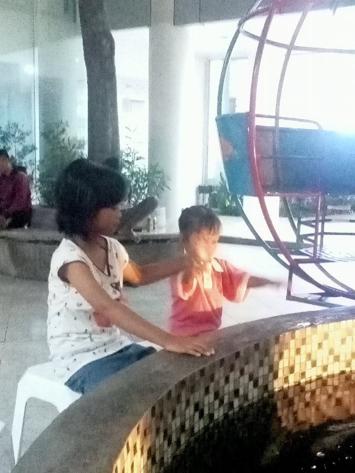 The image depicts an indoor or semi-enclosed recreational area in Unknown, Unknown. In the foreground, a dark-haired child, appearing to be an older child or pre-teen, sits on a white plastic stool. This child wears a light-colored patterned short-sleeved top and dark trousers, with their left hand resting on the curved, mosaic-tiled edge of a water feature. Their right arm is extended towards a younger, dark-haired child in a pink collared shirt, who stands or kneels next to the water feature with both arms raised in a blurred motion, suggesting interaction with water. In the background left, a third individual in a dark red shirt is seated on a curved bench. The environment features large white architectural pillars, glass walls, green foliage, and a prominent blue and red playground structure, resembling a small Ferris wheel, positioned to the right of the children. The area is brightly lit.