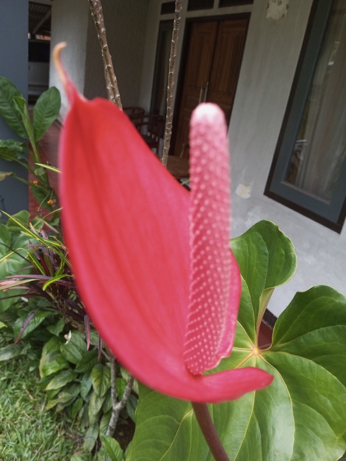 A close-up photograph depicts a vibrant reddish-pink Anthurium flower positioned in the foreground, its distinct spathe and textured spadix prominent. Surrounding the flower are various green plants and foliage. In the blurred background, a light grey building facade is visible, featuring a set of brown double wooden doors centrally located. To the right of the doors, a dark-framed window with reflective glass is present, and to the left, another opening or window is partially obscured. Faintly discernible behind the flower are dark furniture pieces, possibly a chair, suggesting an outdoor patio or porch area. The scene is located in Naya Andura, India. No individuals are present.