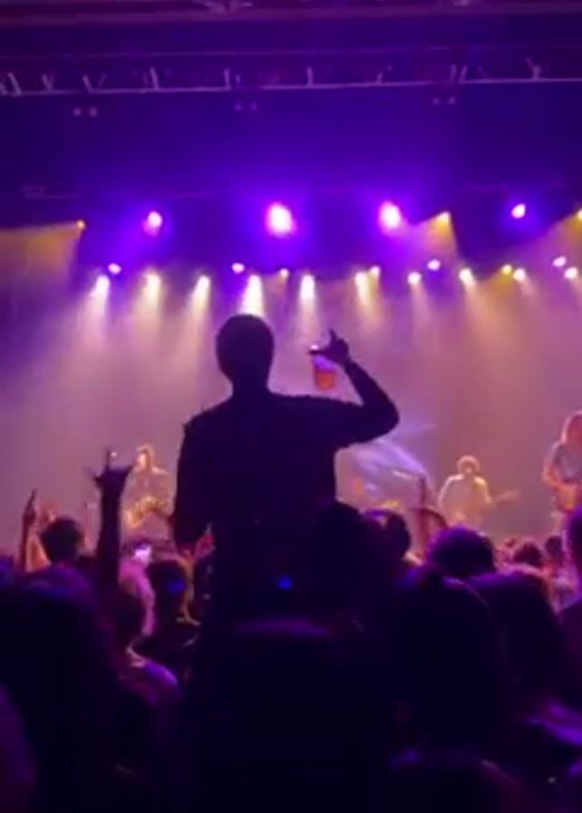 A concert scene is presented from the perspective of the audience. Silhouetted figures, presumably attendees, are visible in the foreground, their bodies mostly obscured by the darkness. One individual, slightly elevated, stands out. They are silhouetted and hold up a beverage in one hand, suggesting active participation in the event. The stage is in the background with musicians and a prominent display of stage lights bathing the scene in hues of purple and white. The lighting creates an atmospheric haze that adds to the concert feel. It is not clear whether the silhouetted figures are dancing or jumping, but they appear to be actively enjoying the concert.