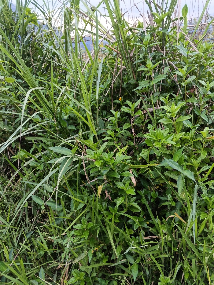 The image displays an overgrown natural scene characterized by dense green vegetation. The foreground and mid-ground are dominated by a mix of tall, slender-bladed grasses and lower, bushier plants with smaller, ovate leaves, all exhibiting various shades of green. Interspersed among the live foliage are several dry, light-brown plant stalks. A single small yellow flower is visible among the green leaves in the upper right quadrant of the image. The background is out of focus, showing a hazy, light-colored sky above a distant, indistinct landmass which appears to be hills or mountains. No people, animals, or significant man-made objects are present. This scene depicts an uncultivated outdoor area, consistent with rural or semi-rural environments near the city of Chengdu, China.