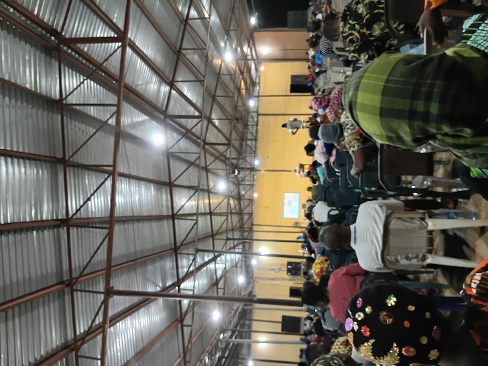 A large indoor gathering takes place under a metal-framed structure with corrugated walls. Rows of individuals sit in chairs, seemingly focused on a central stage area with a screen. The crowd features diverse attire, including patterned fabrics and head coverings. A few individuals stand at the back, observing the event. Overhead lighting illuminates the interior space, casting shadows across the room.