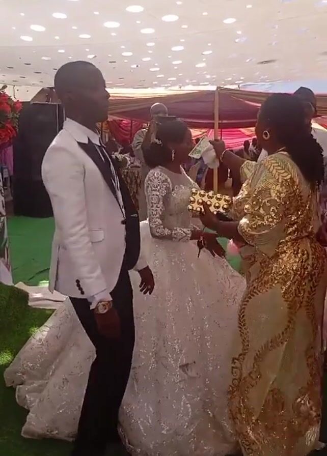 The video captures a wedding celebration under a white tent with a speckled ceiling. A newlywed couple is the focal point. The groom is a dark-skinned man wearing a white suit jacket with black trim, a black tie, and black pants, and the bride wears a white, long-sleeved, floor-length gown with sparkly silver embellishments. They are standing on a square patch of artificial green turf, where a woman in a gold and white patterned dress is interacting with the bride, seemingly in conversation. A man in an olive green shirt approaches them, holding what appears to be money in his hand, which he places on the bride's head. Several other people can be seen in the background, including individuals who are taking pictures with their phones. Red flowers and decorative fabrics are visible behind the group. A large speaker is visible on the left, suggesting music and festivities.