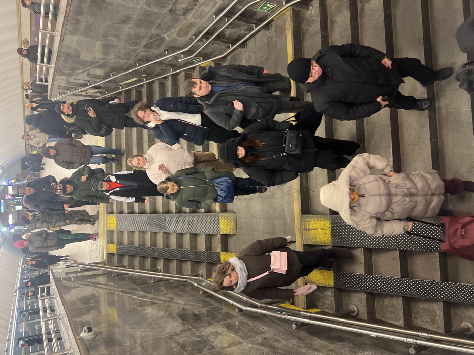 A crowded subway station staircase is filled with pedestrians. Most wear winter attire, including heavy coats, hats, and scarves. They descend the stairs in an orderly fashion, some holding luggage. A handrail is visible on the left side. The stairs have a ramp for accessibility. Overhead lighting illuminates the station.