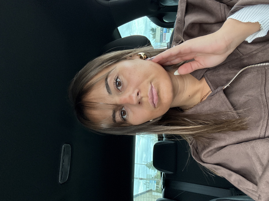 A female individual is depicted within the interior of a vehicle, in Andrézieux-Bouthéon, France. She has light brown hair with bangs, brown eyes, and is wearing a brown collared jacket over a white ribbed shirt, accessorized with a gold-colored hoop earring on her right ear and a thin gold chain necklace. Her left hand is positioned against her left cheek. The vehicle's interior features a dark headliner and dark rear passenger seats. Through the rear window, an exterior scene is visible, including a light-colored building with a dark roof and a blue square sign containing a white directional arrow, indicative of a commercial or public service establishment. Additional elements visible are trees, an overcast sky, and a partial view of another blue and white sign in the distance through a side window. The individual is directly facing the camera.