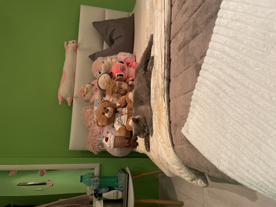 The image depicts a bedroom interior located in the city of Bata, Bulgaria. A gray domestic shorthair cat is shown lying prone and fully stretched with extended limbs on a patterned duvet, positioned on a bed. The bed features a white padded headboard against a solid green wall. Numerous plush toys are arranged against the headboard, including a large pink heart, a brown teddy bear wearing a white shirt with visible Cyrillic text, a purple milkshake-shaped plush, a pink penguin, a spiky-haired character, a pink rabbit-like plush, and a pink Stitch character. A long, slender pink and white striped plush rests horizontally on top of the headboard. To the immediate left of the bed, a small, light-colored, three-legged side table holds a clear water bottle, a green bottle, a white spray bottle labeled 'BIO PET', and a small dark receptacle. A white-framed mirror and several small pink wall decals are visible on the adjacent green wall. The bed's coverings consist of a patterned duvet over a light brown faux fur blanket, with a white ribbed blanket partially covering the lower foreground. The visible floor is white.