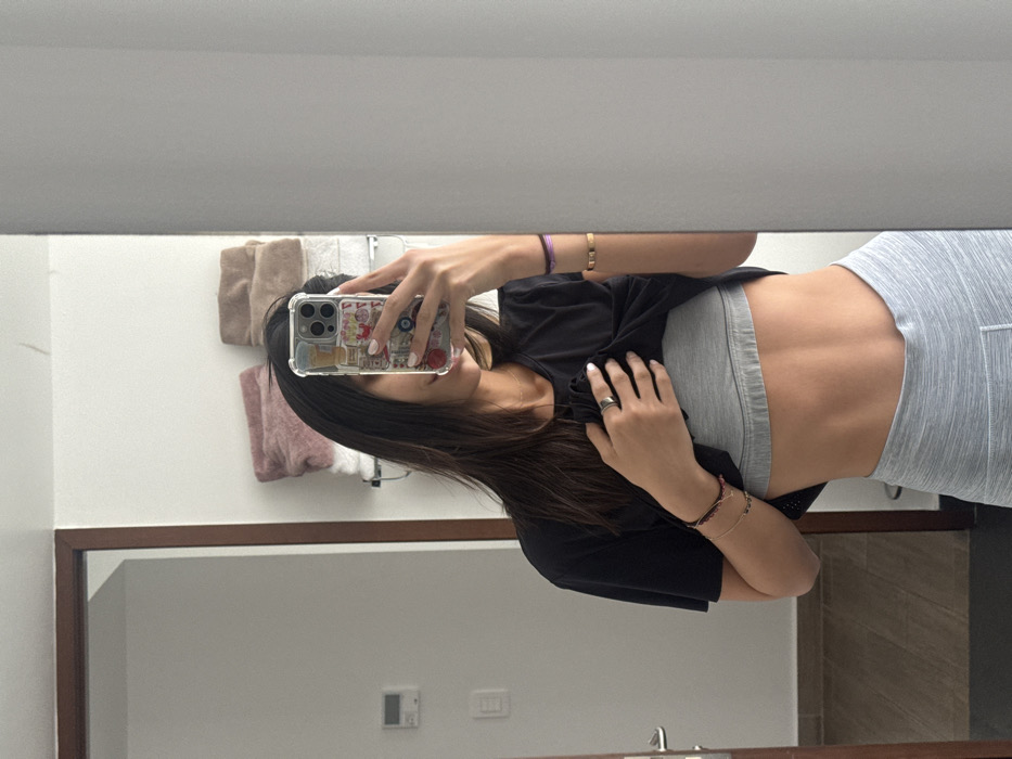 The image displays a mirror selfie of a female individual in an indoor private setting, consistent with a bathroom or dressing area, located in Mexico City, Mexico. The precise address or specific neighborhood within Mexico City is not identifiable from the visual content. The subject is seen from the upper torso to the upper thighs, holding a clear-cased smartphone, decorated with various stickers including currency bills, an evil eye, and floral patterns, in her right hand (viewer's left) to capture the reflection. Her face is partially obscured by the phone, with a portion of a smile visible. Her left hand (viewer's right) rests on her abdomen, slightly raising a black short-sleeved top, which reveals a gray sports bra and her midriff. She is also wearing light gray patterned athletic leggings. Both wrists are adorned with multiple bracelets, including beaded strands, a gold-toned cuff, and a purple band. A silver-toned ring is present on her left ring finger, and her fingernails are painted white. The background, visible as a reflection in the mirror, features white walls. A chrome towel rack holds three folded towels in shades of pink and beige. To the left, a brown-framed doorway or door is visible, alongside a silver door handle and a white rectangular control panel on the wall. The floor in the lower left reflection appears dark. The scene is evenly lit.