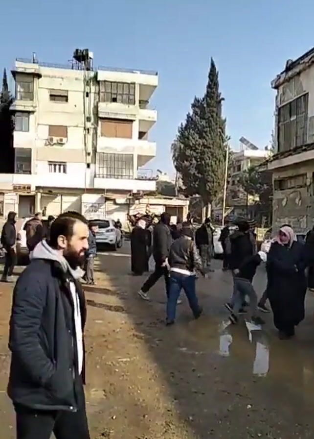 A group of people are walking down a street. The street appears to be unpaved, with patches of dirt and mud. Several of the individuals are wearing dark clothing, and at least one is carrying a flag. Buildings are visible on either side of the street. One man appears to be on the phone.