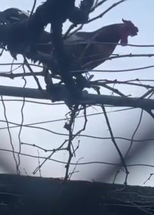 rooster perched on a structure, likely a fence or trellis, intertwined with branches. The rooster is silhouetted against a light sky and crows loudly. The branches partially obscure the rooster, and a wire fence runs in front of the scene.