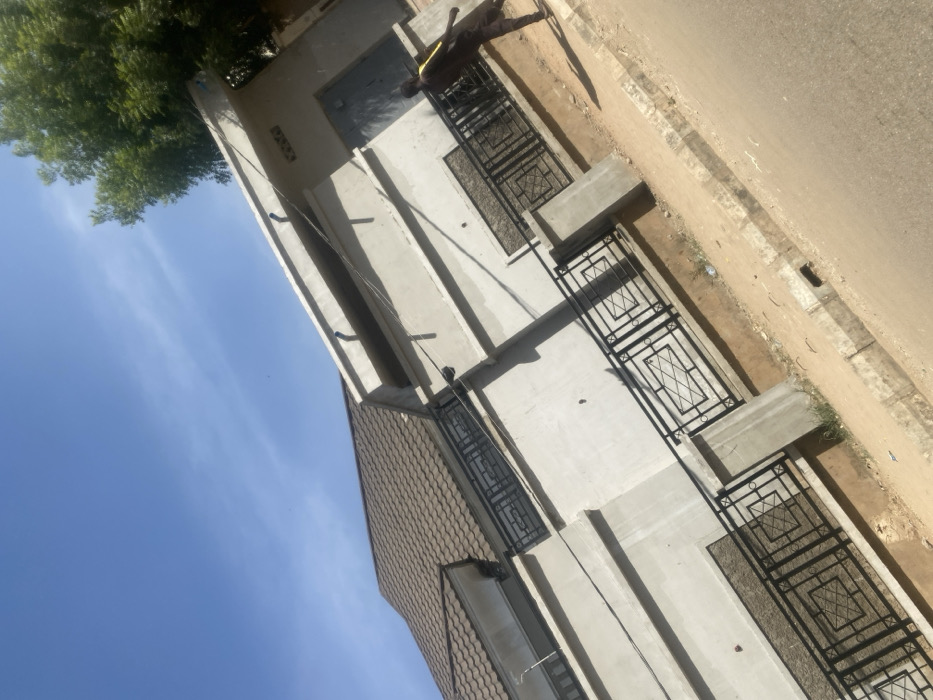 A daylight scene in Dorayi, Nigeria, features a multi-level building with light grey, unfinished concrete walls and a brown, tile-patterned roof