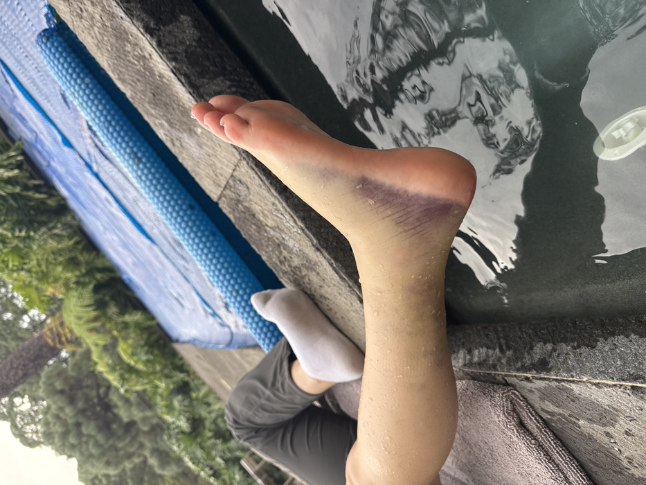 A person sits beside a pool, dangling their right leg in the water. A large purple bruise marks the ankle and heel of the foot. The leg and foot appear wet. The person is wearing grey pants and a white sock on the left foot. A blue foam pool noodle rests nearby on the concrete edge of the pool, which is lined with a dark stone material. Water reflects light in swirling patterns. Green foliage is visible in the background.