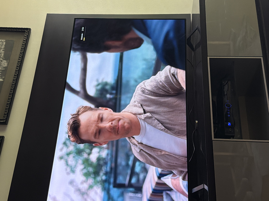 A television screen displays a man with blond hair wearing a white shirt and linen jacket. The man is the focal point of the image on the screen. Above him is another individual with dark hair. To the right of the television screen is a black gaming console with blue indicator lights. The television screen is encased in a black frame with a decorative design on the side. The image is slightly rotated.