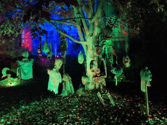 - "A spooky outdoor Halloween display features hanging heads, severed torsos, and a skeleton propped up against a tree" by FM-w9aT23, licensed under CC BY 4.0