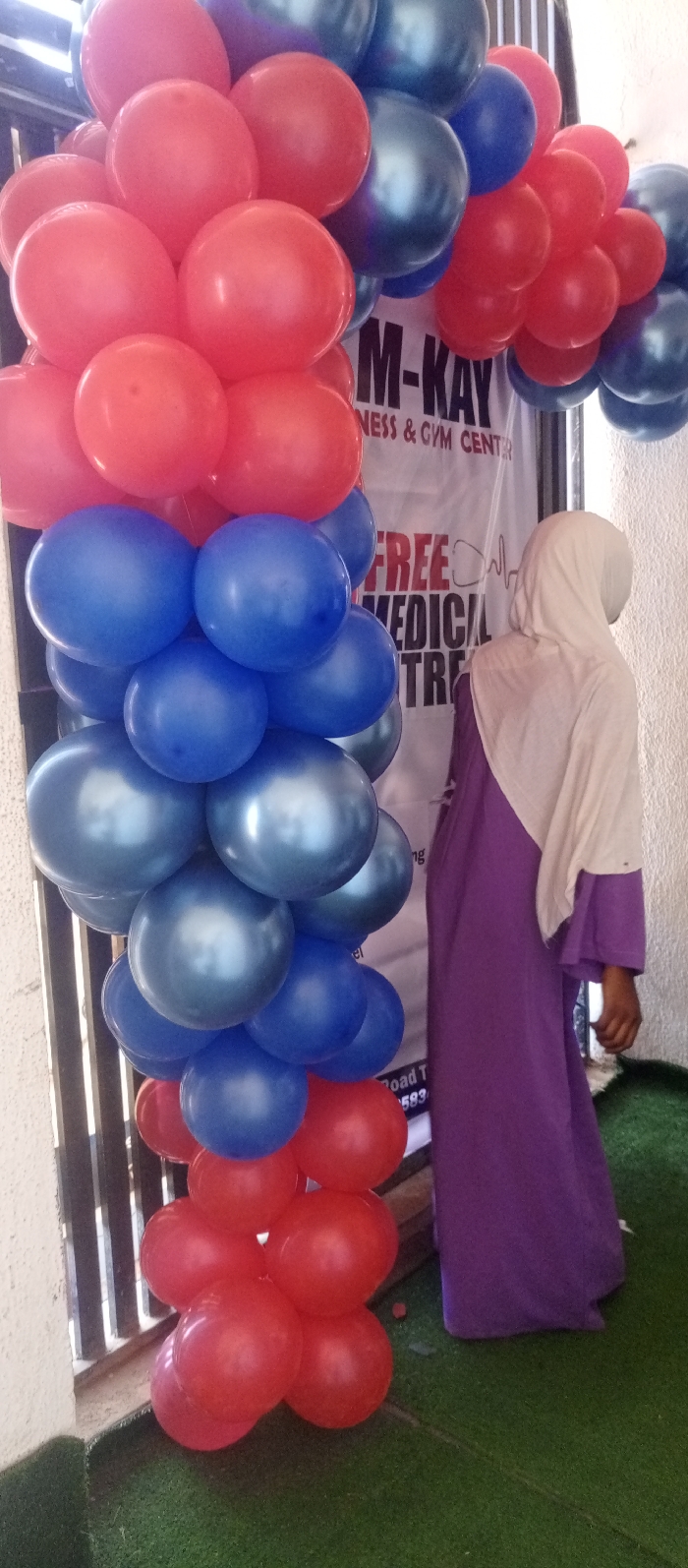 The image displays an outdoor scene in Gwong, Nigeria, featuring a decorated entrance area. A prominent balloon arch or column, composed of numerous red, royal blue, and metallic blue balloons, occupies the left and upper-middle portions of the frame. Behind the balloons, a white banner with black text is visible. Identifiable text on the banner includes "M-KAY," "FITNESS & GYM CENTER," and partially visible "FREE MEDICAL TR" accompanied by a red graphic resembling a stethoscope or heartbeat line. Further down, "Road T" and numerals are present. On the right side of the frame, a single individual is depicted from the mid-torso up, facing away from the camera and looking to the right. This person is dressed in a long, loose-fitting purple garment and a light cream-colored headscarf. The visible portion of their right arm and hand indicates a medium-dark skin tone. The ground surface is covered with green artificial turf. A light-colored wall is visible on the right, and a dark vertical structure, likely a door frame, is on the far left.