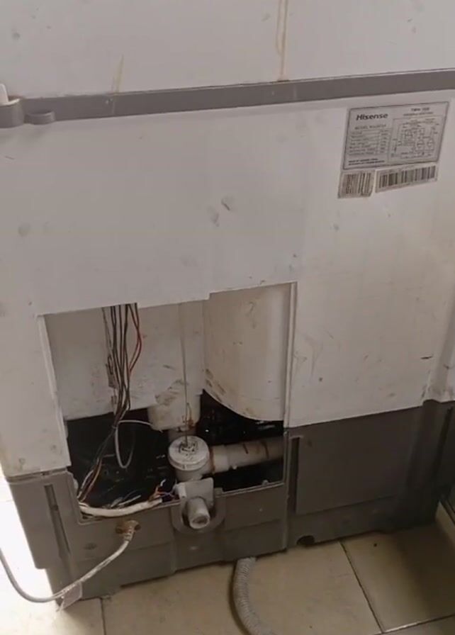 back and top control panel of a Hisense washing machine. The back panel is partially open, revealing some of the internal components, including wiring and plumbing. The control panel has three dials, each with multiple settings. The washing machine is located in what appears to be a tiled utility area.