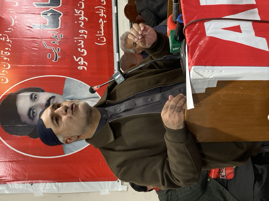 An indoor public speaking event is depicted in Quetta City Tehsil, Pakistan