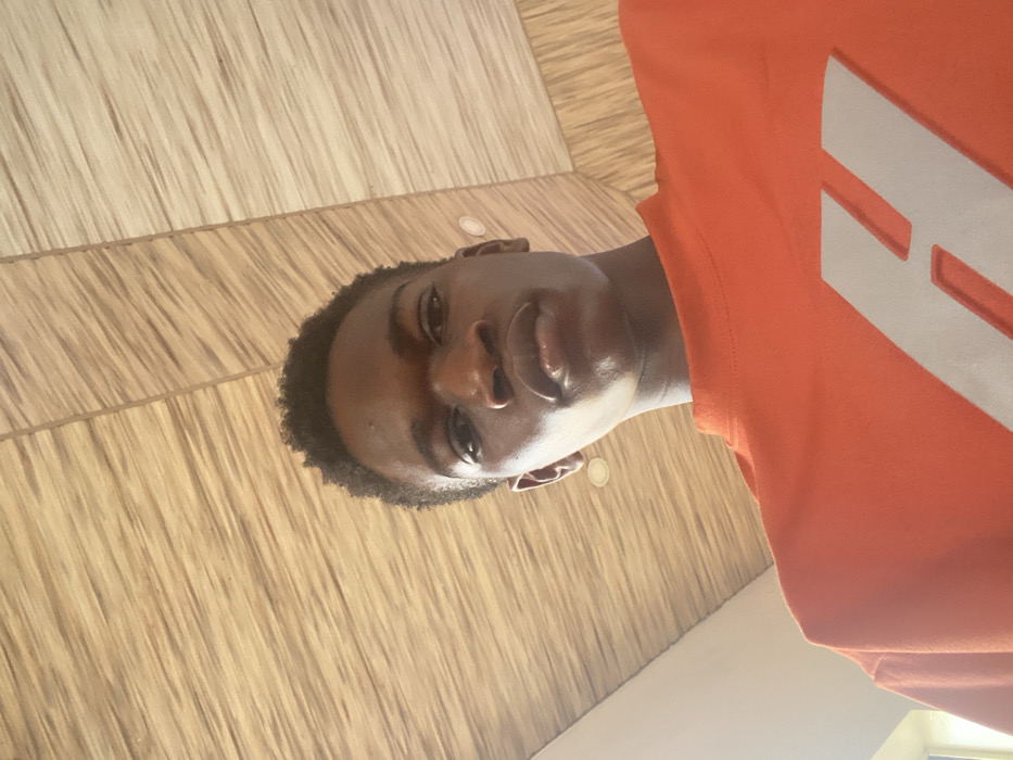 A young Black man, turned sideways to the camera, wears an orange t-shirt with a large, white, angular design. He has short, dark hair. His eyes are looking directly at the camera. The background includes wood-patterned wallpaper or paneling and a white ceiling with what appear to be recessed lights. The scene is brightly lit with natural or overhead lighting, casting slight highlights on his skin.