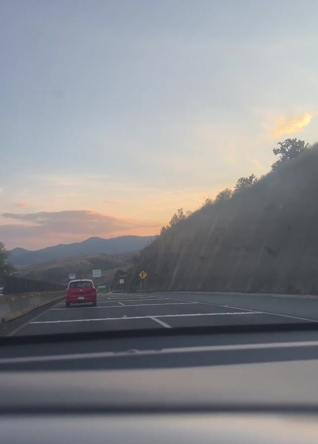 A video taken from the interior of a moving car shows a view of a highway at dusk. The sky is a light blue with faint orange and pink hues from the setting sun. In the distance, mountains are visible, their shapes softened by the twilight. To the right of the road, a steep, grassy hillside rises, silhouetted against the fading light. A few scrubby trees are visible along the hillside. A red car is driving in the same direction, some distance ahead in the center lane. Road markings divide the lanes, and there are barriers to the left side of the road. A yellow and black road sign is visible on the right, near the hillside. The dashboard of the car, from which the video is recorded, is visible at the bottom of the frame. The general impression is of a quiet, scenic drive at the end of the day.