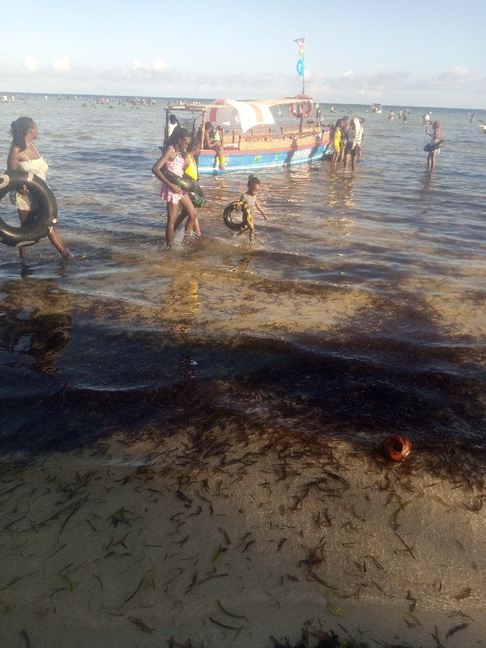 The scene depicts a daylight coastal environment in Shanzu ward, Kenya. Multiple individuals are present in shallow ocean water. In the foreground, an adult female with a dark complexion, wearing a light-colored top, wades right through the water while holding a black inflatable swimming ring in her left hand. Ahead of her, two children, also with dark complexions, wade right. One child wears a pink and white patterned swimsuit and carries a dark green/black inflatable ring. The younger child wears a patterned yellow and black outfit and carries a smaller black inflatable ring. In the mid-ground, a blue and yellow/orange boat, identified by the visible word "SHORE" on its hull, is partially submerged in the water. The boat features a canopy and a flag pole displaying a Kenyan flag and a blue flag. Several individuals are clustered around and on the boat. To the far right, a solitary individual stands in the water near the boat. Further out in the background, numerous additional people are visible, engaged in recreational activity in the ocean. The water's surface exhibits ripples, and the sandy seabed is visible in patches, heavily covered with dark brown and green seaweed or seagrass. A reddish-brown object, consistent with a coconut husk, rests on the seabed in the lower right foreground. The sky above is clear with some scattered clouds.