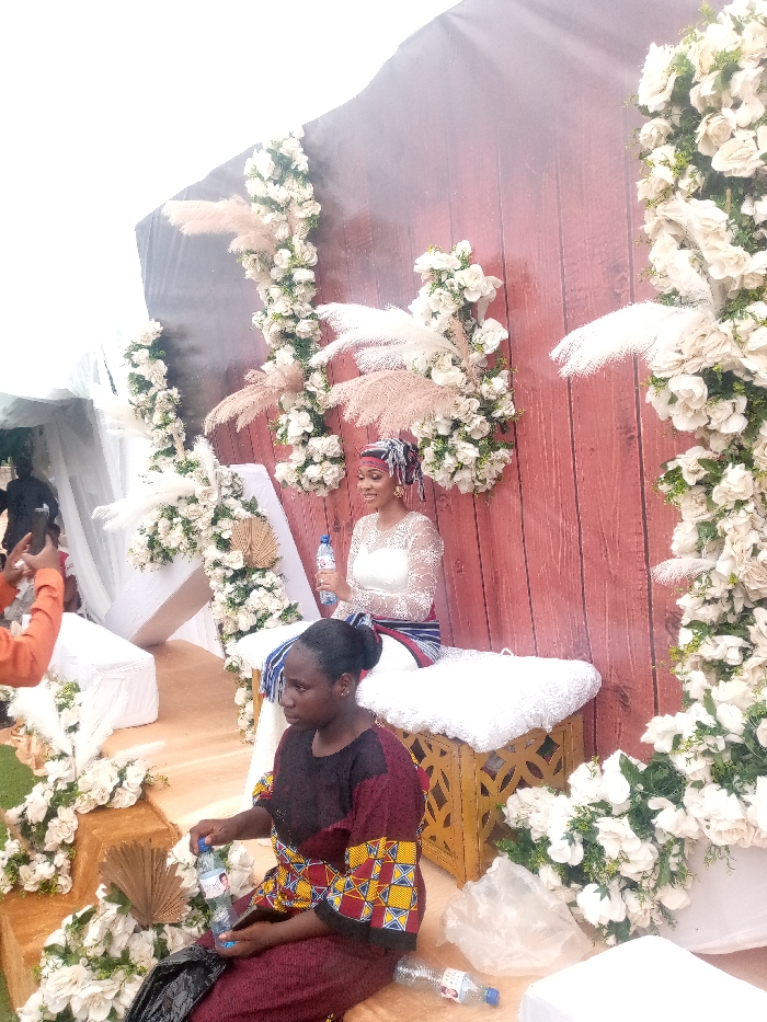 The scene depicts a wedding ceremony or reception taking place at a location in Lafia, Nigeria (latitude: 8.511, longitude: 8.519). There are two women present. One woman, dressed in white, is seated on a white cushioned stool and is holding a bottle of water. She is wearing a white headwrap. The other woman, wearing a burgundy and yellow patterned dress, is seated in front of the first woman and is holding a bottle of water. She is looking down at her hand. Both women are positioned in front of a backdrop made of a red wooden wall adorned with white flowers. The backdrop is decorated with numerous white flowers arranged in a garland-like fashion. There is an abundance of white flowers on the ground in front of the women as well. The scene is set in an outdoor location. The ambient light is bright and natural.