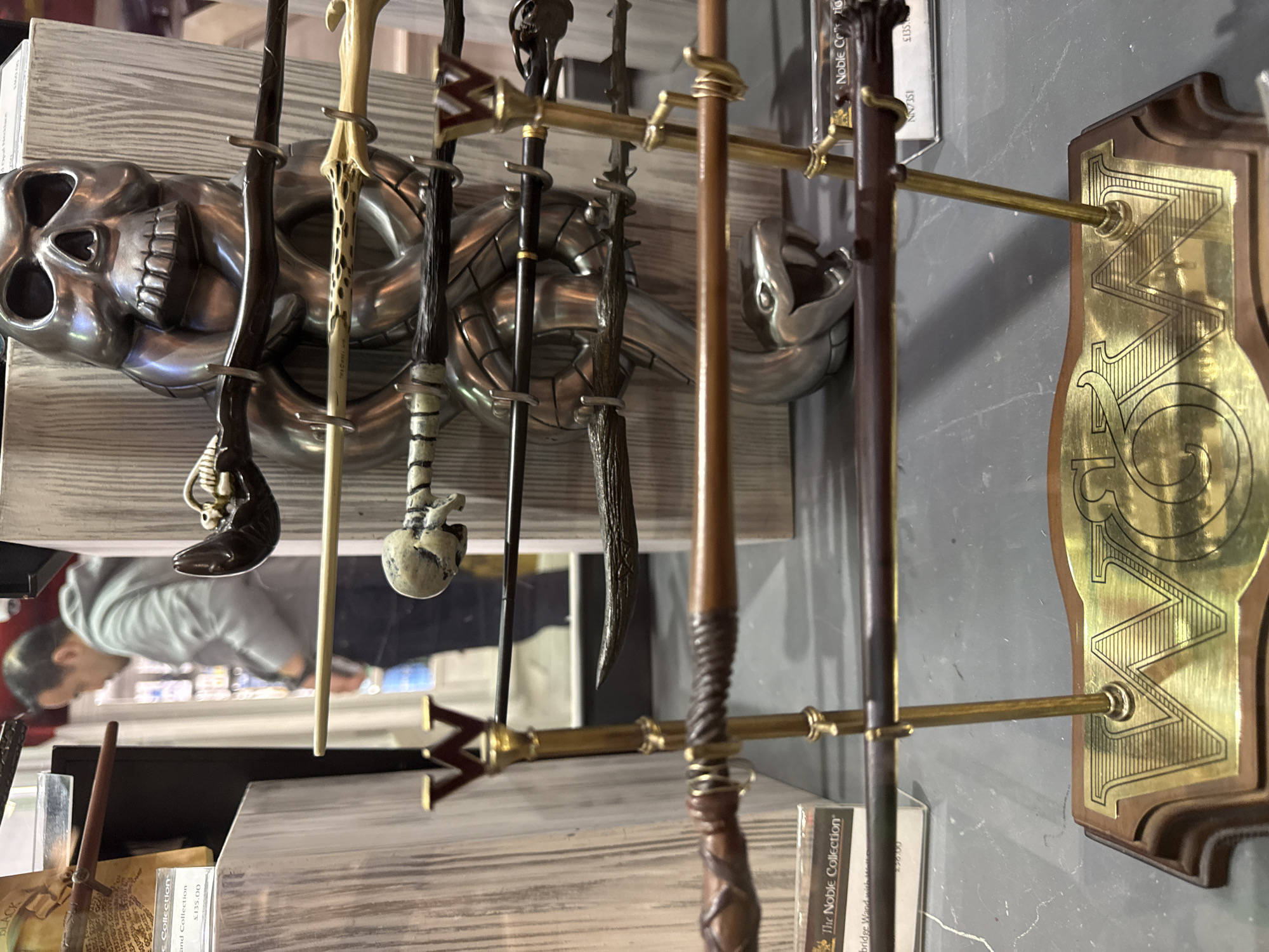 display of Harry Potter-themed wands in a store, possibly in London, United Kingdom, given the merchandise available and the UK-style pricing on display. The wands are arranged on a stand with a metallic skull in the background. Other objects in the scene include books and associated merchandise. A person is seen reflected in the reflective surface.