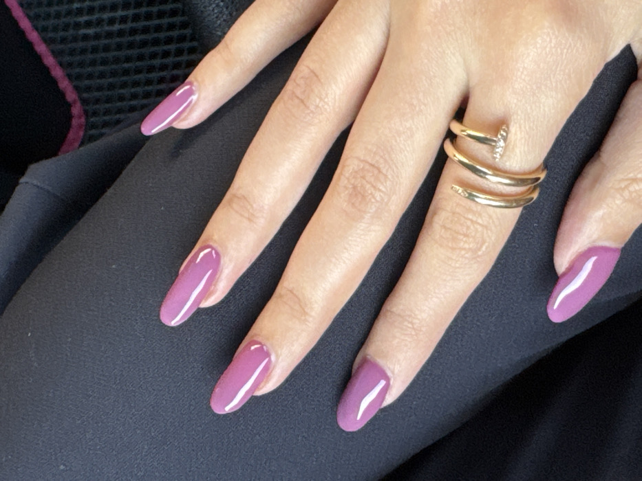 A close-up, top-down view captures a person's left hand resting on a dark, likely black, fabric surface. The hand exhibits light-brown skin. All visible fingernails are long, uniformly oval-shaped, and coated with a glossy, solid magenta-purple nail polish. A three-band gold-colored ring, resembling a coil or wrap-around design, is worn on the ring finger. One segment of this ring features a small, T-shaped accent adorned with multiple tiny, clear stones. The immediate background consists of the dark, untextured fabric, possibly clothing or vehicle upholstery. A hint of a dark mesh pattern and a narrow strip of magenta-colored material are partially visible in the upper right background. The scene is located in Yerevan, Armenia.